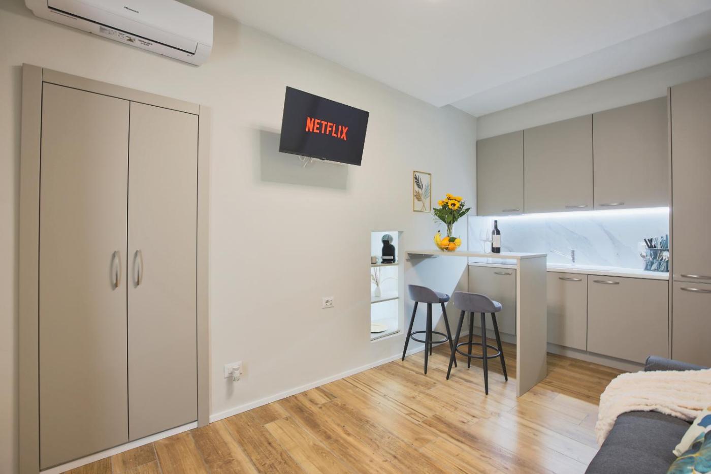 One-Bedroom Apartment. Boasting a private entrance, this air-conditioned apartment features a kitchen, 1 bedroom and 1 bathroom with a shower and a bidet. A kitchen fitted with a stovetop, a refrigerator and kitchenware is available for cooking and storing food. The apartment features a washing machine, a coffee machine, a seating area, a flat-screen TV with streaming services, as well as ancourtyard view. The unit has 1 bed.